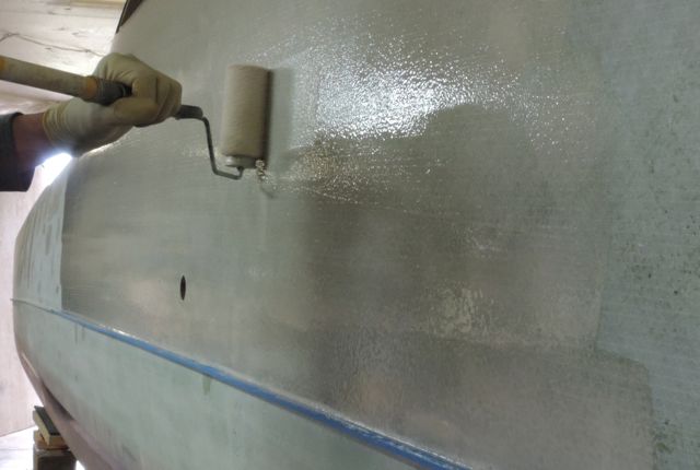 I rolled (and tipped with wide foam brushes) a coat of 105/207 over the entire boat after fairing and this coat will be lightly sanded before paint. No primer will be used.